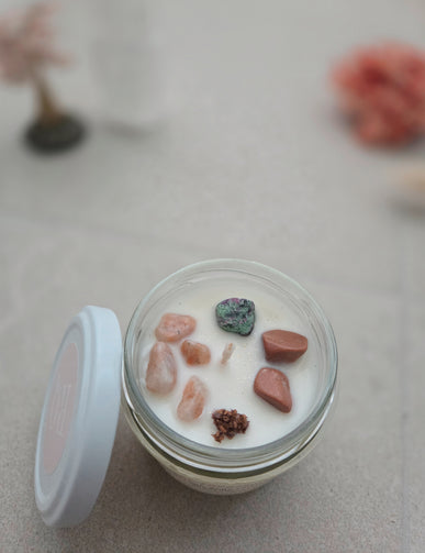 Topping this candle are three carefully selected crystals, each chosen for its unique energies and aesthetic charm: